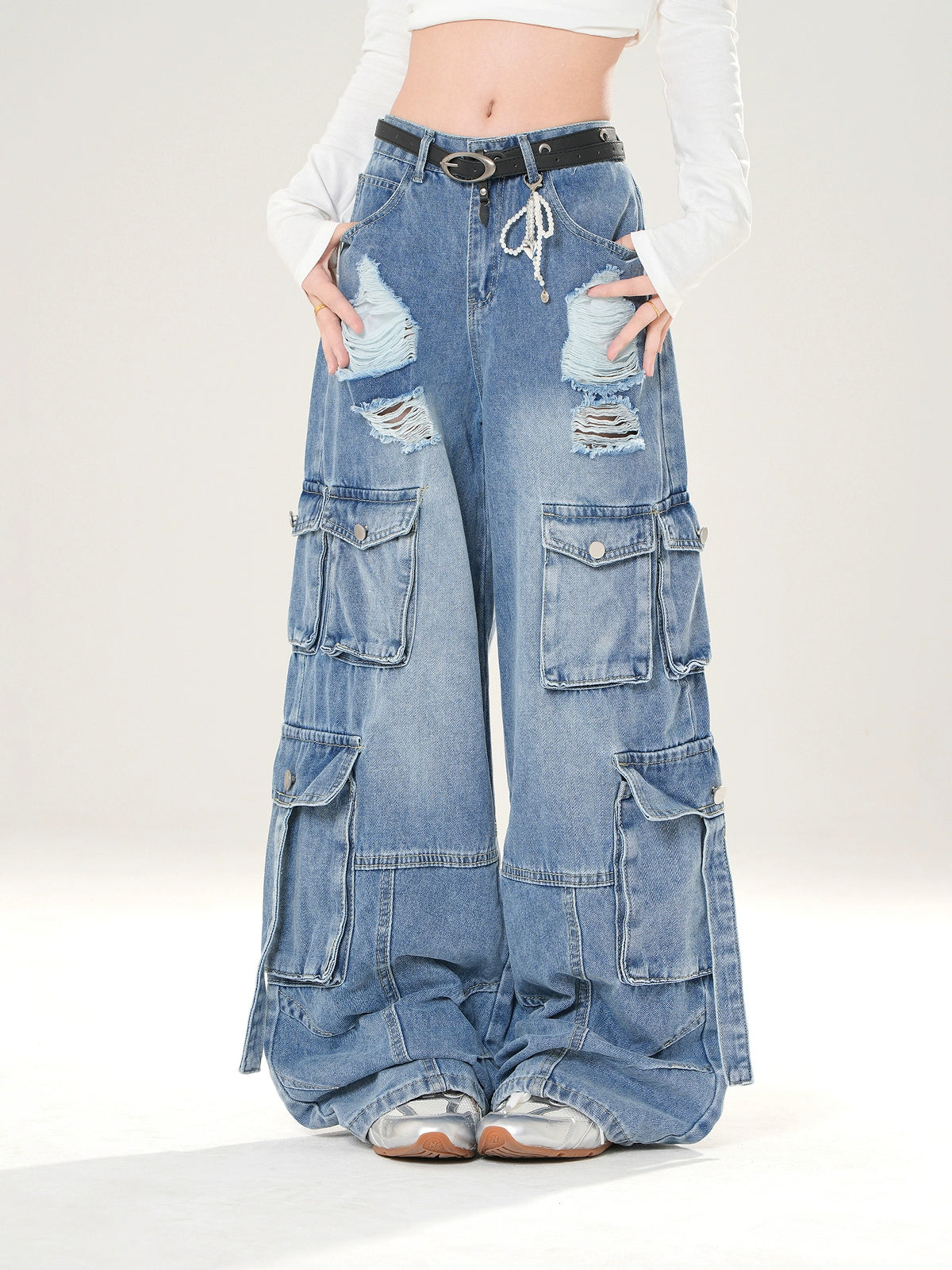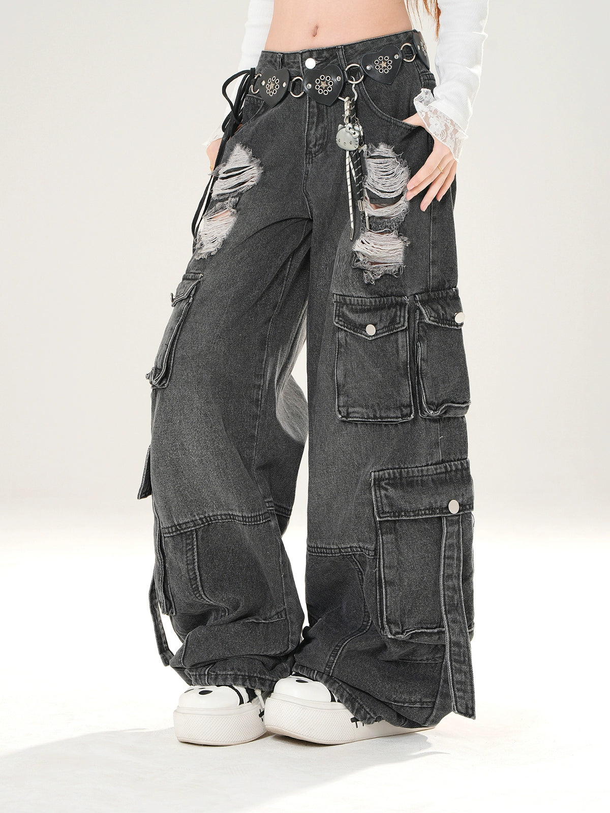 Wide Leg Ripped Cargo Denim Pants