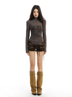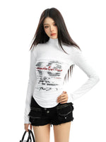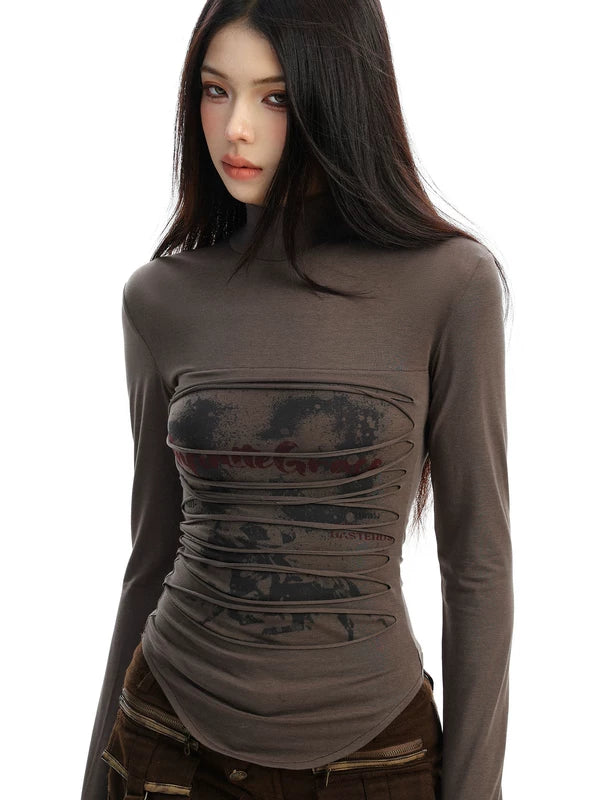 Distressed Print Turtleneck Long Sleeve Top