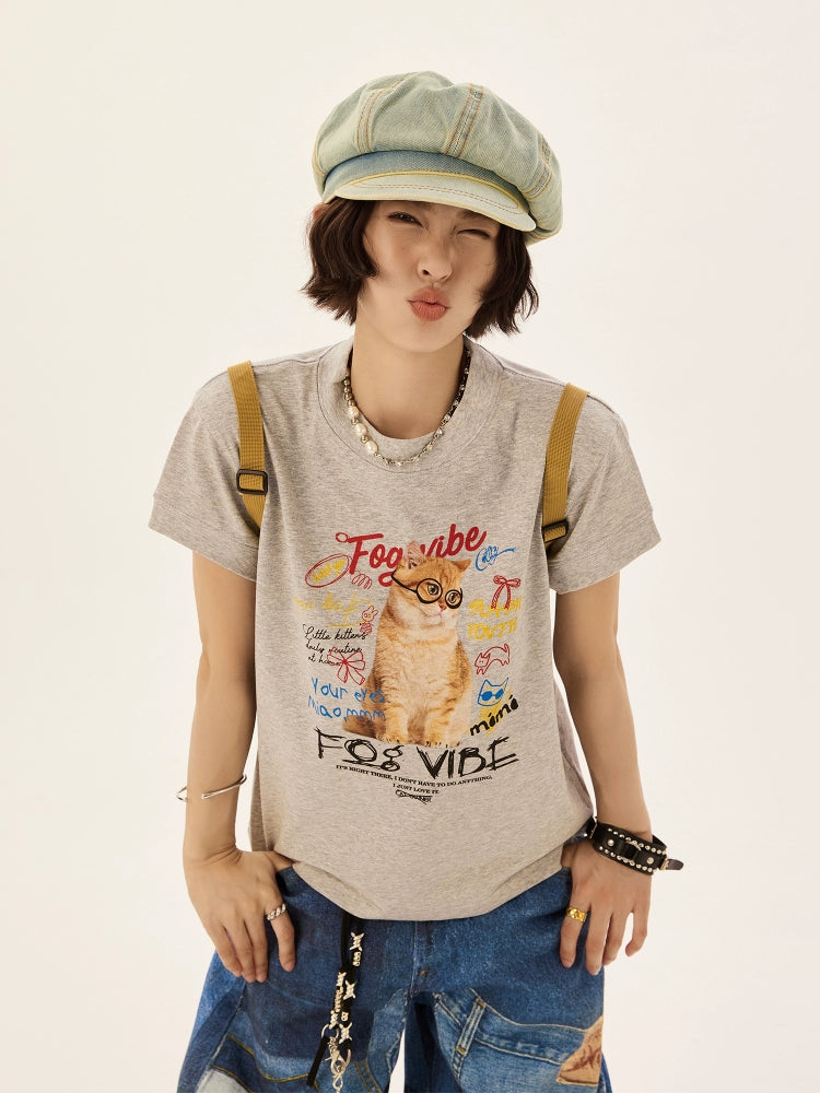 레트로 고양이 그래픽 박시 반팔 티셔츠