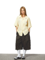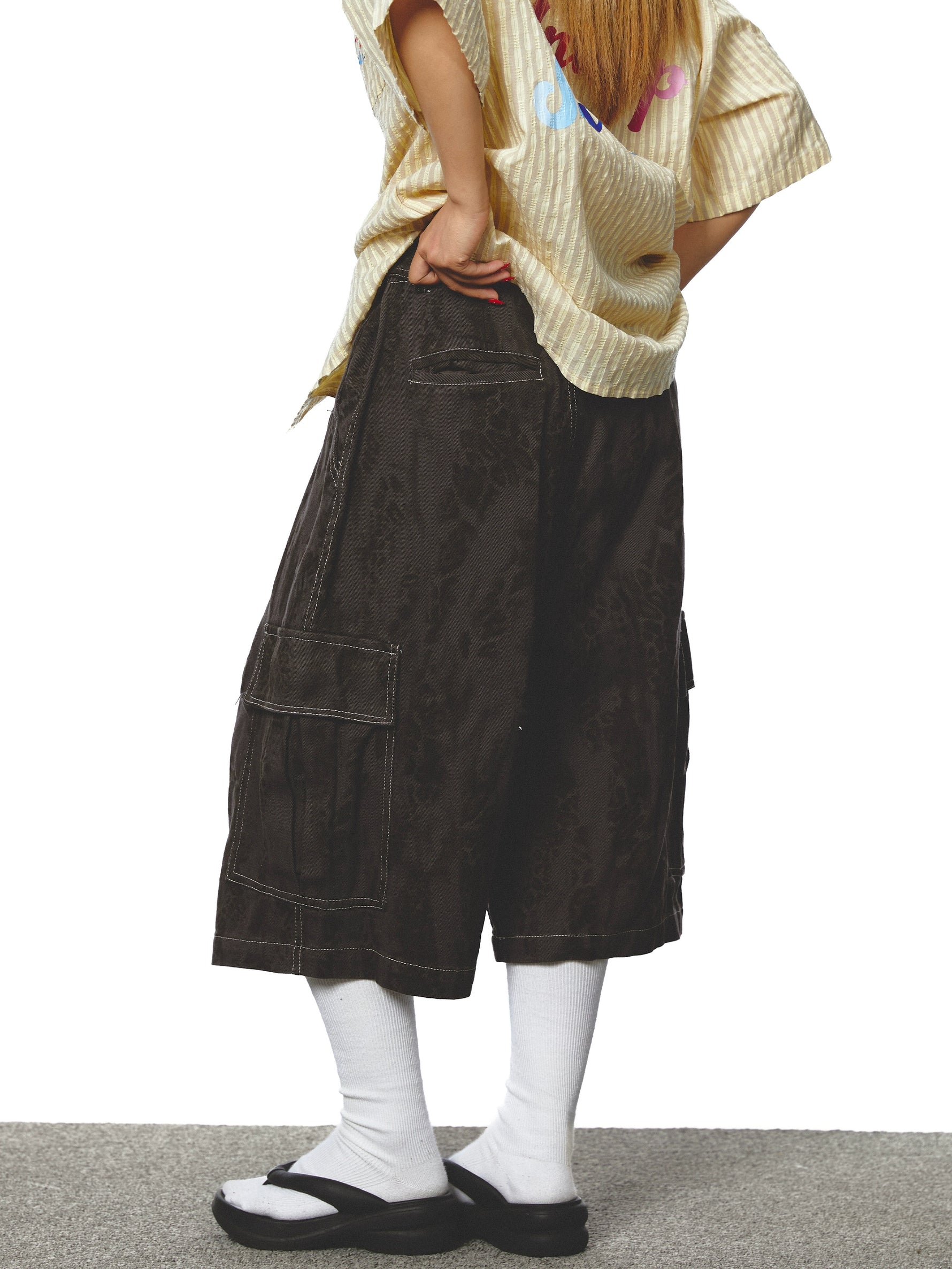 Calças de perna larga com múltiplos bolsos em estampa de onça